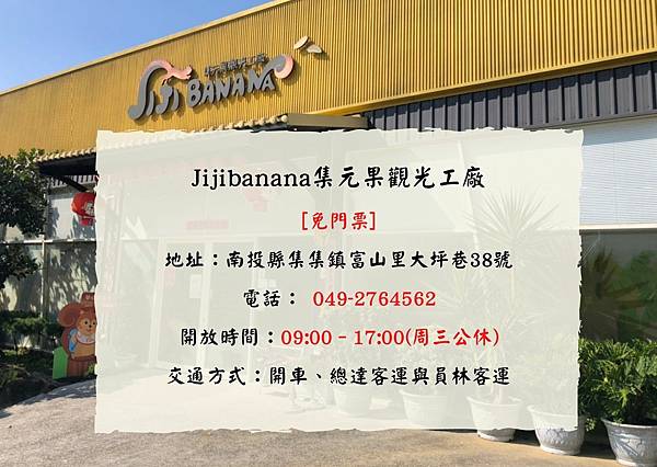 牛耳藝術度假村 Post author:nantoutraveler Post published:2021 年 9 月 24 日 Post category:優惠店家 Post comments:0 Comments 優惠內容:樹屋餐廳、鐵板燒餐廳優惠不收一成服務費 地址: 南投縣埔里鎮中山路四段1號 電話: 049-2912248 取得優惠 【Jijibanana集元果觀光工廠】|免費入園 在地傳承 山蕉文化 蕉味美食 親子友善 @ 鎮食 :: 痞客邦 ::香蕉是大眾所熟知的水果,關於香蕉你了解多少呢~ 香蕉能幫助減重,維持腸道健康,最重要的是能降低膽固醇和預防大腸癌, 在菜市場隨處可見,但卻越看越朦朧,出產地、產期與過程一無所知。 不過沒關係,J You Might Also Like 籃城書房 2021 年 9 月 24 日 木生昆蟲博物館 2021 年 9 月 24 日 埔里飛行傘有限公司 2021 年 9 月 24 日 發佈留言 取消回覆CommentEnter your name or username to comment Enter your email address to comment Enter your website URL (optional) 在瀏覽器中儲存顯示名稱、電子郵件地址及個人網站網址,以供下次發佈留言時使用。